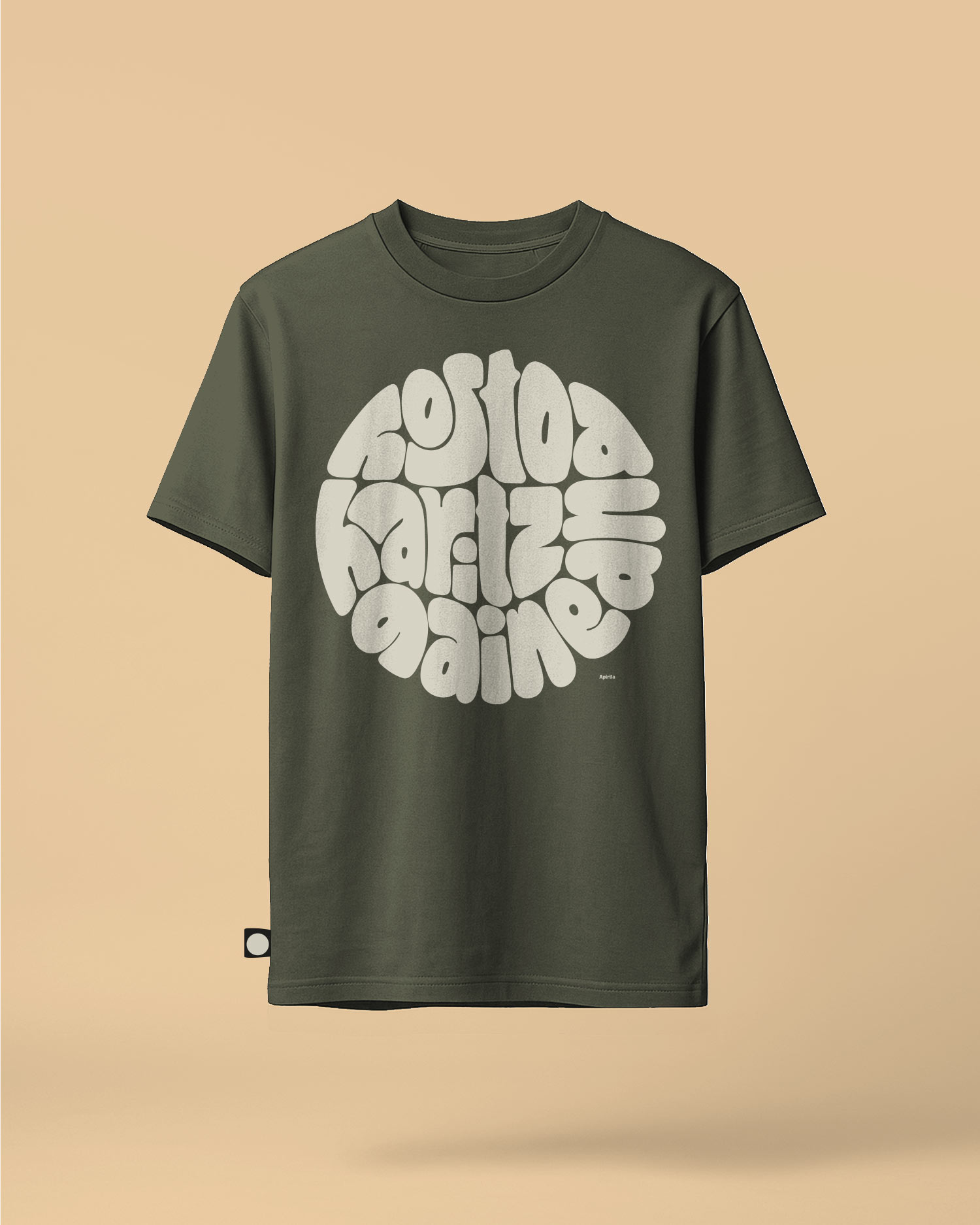 Deskribapena: Kaki koloreko kamiseta. Forma normala. Lepoko barne-zinta oihal berean. 1x1eko erribetea lepoan. Ur-oinarria duen tintarekin serigrafiatua, kolore bakarrean, PVC eta ftalato gabe. Konposizioa: Jersey puntu sinplea, %100 kotoi organikoa, garbitutako oihala. Pisua: 180 GSM