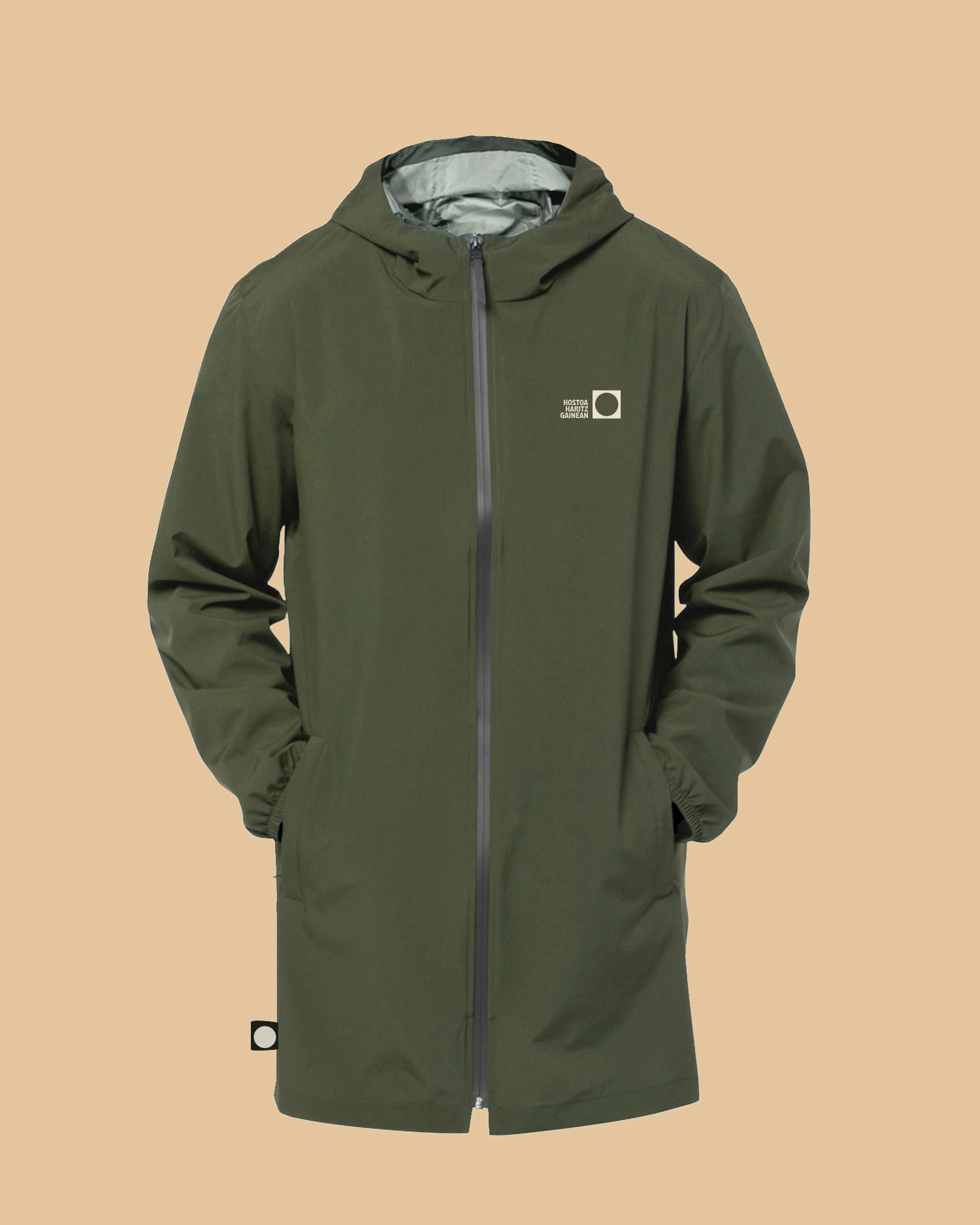Deskribapena: Kaki koloreko txanodun txaketa. Forma zuzena. Transpiragarria eta iragazgaitza. Jostura termozigilatuak, produktua iragazgaitzeko. Bi poltsiko, erribete eta kremailerarekin. Txapela kordoiarekin. Mahuka azpian elastikoarekin. Konposizioa: %100 poliester birziklatuarekin eginda.