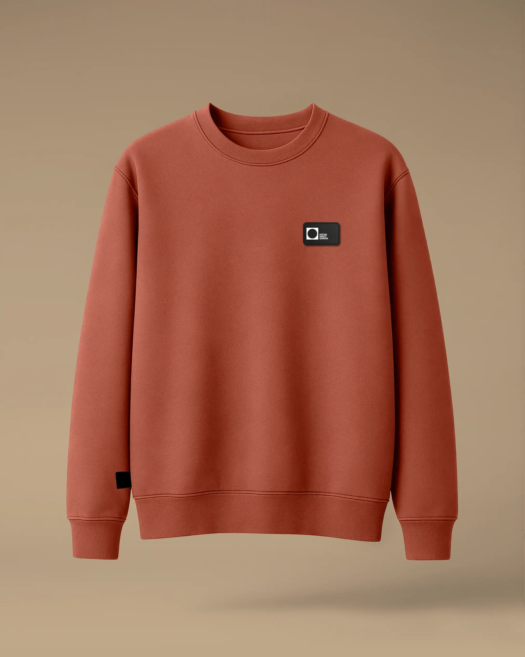Deskribapena: Lurraren koloreko jertsea. Forma normala. Lepo biribila. Mahuka muntatua. 1x1eko erribetea lepoan, eskumuturretan eta behean. Oihal berdinarekin egindako sendogarria bizkarrean. Bihotz partean jositako gomazko partxea, kolore bakarrekoa. Konposizioa: Felpa pertxatua, %85 Kotoi organiko orraztua eta %15 poliester birziklatua. Garbitutako oihala. Pisua: 280 GSM