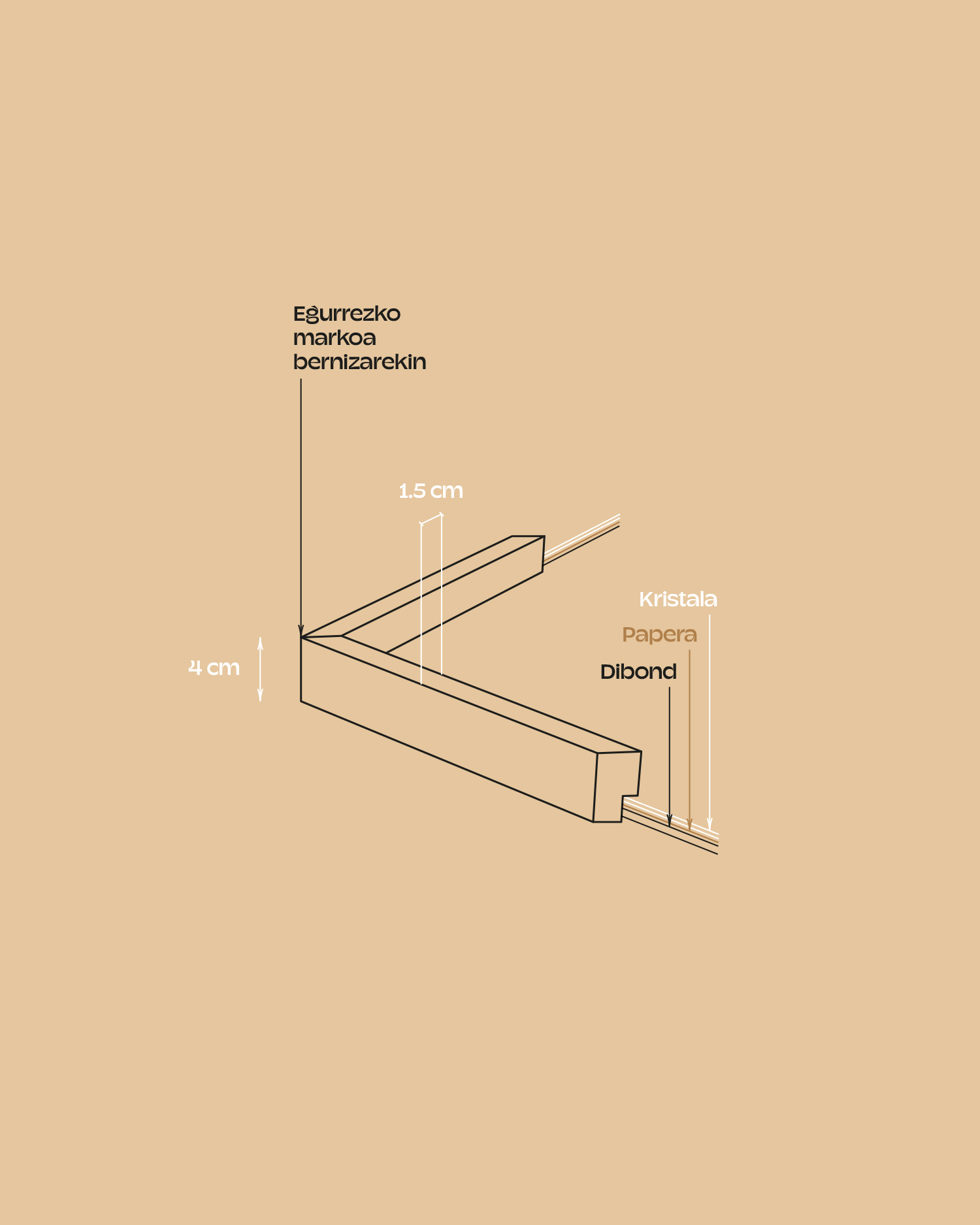 Titulua: Puntu Larrosa. Egilea: Hostoa Haritz Gainean. Serie Mugatua: 1/5 Teknika: Inprimaketa pigmentarioa paper satinatuan. Neurriak: 725*1020mm Euskarriak: Egurrezko markoa kristal distiratsuarekin · 7,7kg. Sortze data: 2025